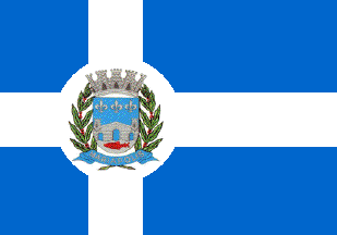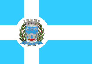 The flag of Mariápolis is blue with a white, off-centered cross. Over the intersection of the cross' arms is placed a white disk charged with the municipal coat of arms.