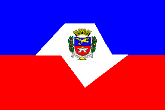 The flag of Orlândia is prescribed by Municipal Law No. 867, adopted for the celebration of the 64th anniversary of the town. The flag is horizontally divided blue-red. In the middle of the flag is placed the white, simplified contour map of São Paulo State, charged in the middle with the municipal coat of arms.