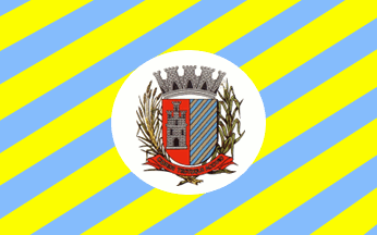Diagonally striped yellow and blue with the municipal arms in the centre on a white disk.