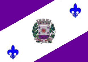The flag of Terra Roxa, designed by Lauro Escobar, is prescribed by Municipal Law No. 155 of 6 July 1974. The flag is purple with a white diagonal bend sinister charged [in the middle] with the municipal coat of arms surrounded [in chief and in base] by two blue fleurs-de-lis.