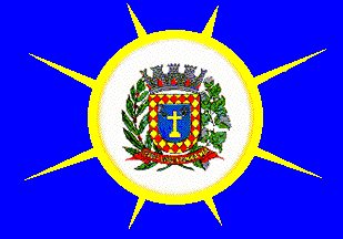 A blue flag with a white disk bearing the municipal arms in the centre, surrounded by a yellow ring with eight yellow rays emanating from it.