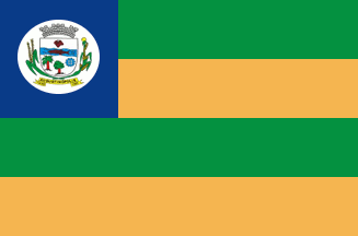 Horizontally striped, green-yellow-green-yellow, with a square blue canton two stripes deep, bearing the municipal arms.