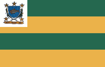 Four green and deep yellow horizontal stripes and the municipal arms on a small white canton, 1.5 stripes deep.
