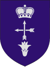 The arms are azure an arrow argent per pale pointing upwards