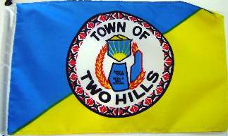 The municipal flag of Two Hills, Alberta has a design and colors (blue and