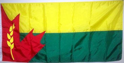 The design chosen is a white flag with a red half maple leaf against the hoist, bearing a small wheat head in black, and the name CROSSFIELD written across the flag, with a bucking bronco above the "ro".