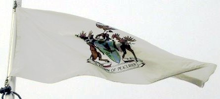 The flag of the Town of Peace River, Alberta, is white with town coat of
