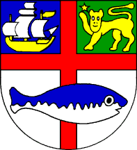 The coat of arms is quartered a cross Gules throughout and the I Azure a ship Or dressed Argent and flagged Or and the II Vert a lion passant guardant Or holding an estoile Or on his dexter and the III and IV plain Argent and in base overall a codfish Azure bellied (?) Argent naiant and on a chief Argent the word "Burgeo" Sable. It is debatable whether the inscription is or not part of the shield but the offset placement of the cross core seems to imply it is.