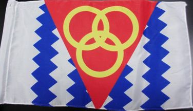 The flag is white with four vertical zig-zag stripes, overlain by an inverted red triangle bearing 3 interlocking yellow rings.