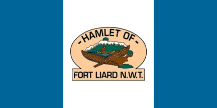 Unequal triband of dark blue, white and dark blue charged on the white area with a local badge. This consists of the contour of a lying ellipse intersected with a rectangle at the base, upon which there is a canoe scene featuring a river and a mountain skyline behind and above a pair of crossed snow shoes and an animal fur. Arched above it, the lettering "- Hamlet of -" and bellow, in a straight line, "Fort Liard N.W.T.".