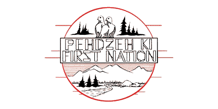 White flag with large local badge on it. This badge is roughly circular, in red and black line drawing, and is divided horizontally by a rectangle reading "Pehdzeh Ki / First Nation" in fantasy capitals; above, two ptarmigans against some spruce trees; bellow, a landscape scene showing a river and more fir trees against a mountain skyline.