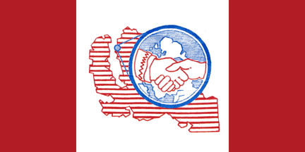 The former flag of the hamlet of Arctic Bay, Nunavut, was a Canadian pale of dark red-white-dark red with a map of northern Baffin Island showing the location of the community, and a blue ring with a handshake inside.