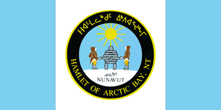 image by Jens Pattke, 14 October 2013The hamlet of Arctic Bay, Nunavut, is a Canadian pale of light blue-white-light blue with a central device showing an inukshuk flanked by two people inside a black ring.