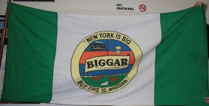 encircled by the words "NEW YORK IS BIG / BUT THIS IS BIGGAR" Photo of the flag courtesy of