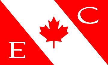 A red flag with a wide white downward diagonal, a maple leaf in the center and white block letters