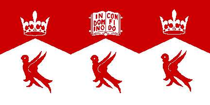 The flag of McGill University is an armorial banner of the university's coat of arms. The exception being the three martlets or birds are placed two above and one below on the arms and on the flag they are on in one horizontal line. The three red martlets are from the coat of arms of James McGill, the founder of the university and are on a white field. The colors red and white are the official colors of Canada. The dancetty partion line along the upper middle of the shield is emblematic of the three hills of Montréal. The book of course represents learning and its inscription 'In Domino Confido' translates as "I trust in the Lord" and is also the motto of James McGill. The two crowns, bearing fleur-de-lis, signifies the location of the university at the base of 'Mount Royal'.Luc Baronian, 9 May 2005