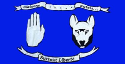 The flag bore a hand, a wolf's head, and two scrolls proclaiming, "maisons, autels," and "Surtout Liberté" (homes, altars, above all freedom). The suggested meaning of the symbols being: "we lift our hand in prayer to the Lord that he may grant us the courage of the wolf to defend our homes." By the end of June, and with Riel in captivity, sovereignty, if not justice, had returned to the prairies.