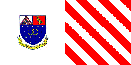 The flag of the association is vertically divided, on the left part white with the coat of arms of the association, on the right part white with six red diagonal stripes.