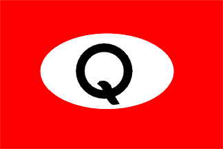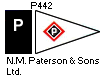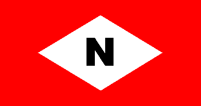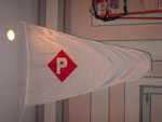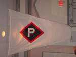 The first version is a white triangular flag with a rounded end, near the hoist is a – rather small - red diamond bearing a white ‘P’. The second version replaces the red diamond by a larger black one, bordered red, and also bearing a white ‘P’. No serifs in both cases. (And no idea when the design was changed.)