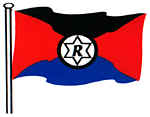 Found on the net as a drawing for the house flag (for a photo present on the company site: click top menu ‘Company’ then ‘News’). Quarterly divided: left and right triangles red, upper triangle black, lower triangle blue; a white black-rimmed disk in the centre bearing a white black-rimmed six-pointed star enclosing a black initial ‘R’.