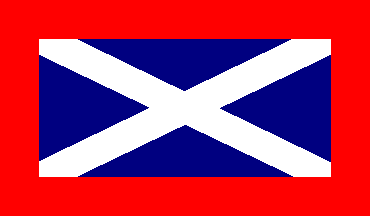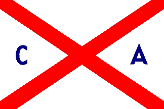 rectangular white flag with a red saltire. The black sans serif letters 'C'