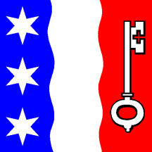Tierced per pale wavy Azure three Mullets Argent in pale, Argent and Gules a Key Argent.