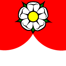 Per chevron embowed Gules and Argent and in chief a Rose of the last