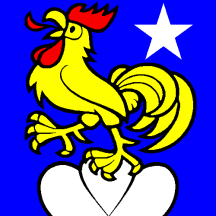 Azure a Rooster hardi crowing Or crested jelloped and langued Gules on a Mount of 3 Coupeaux Argent and in chief sinister a Mullet of Five of the last.