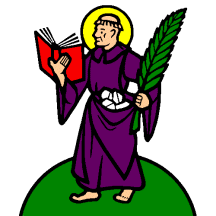 Argent on a Mount Vert St. Stephen proper passant haloed Or clad Purpure holding in his dexter hand and reading an open book bound Gules and in his sinister a Palm Branch Vert and carrying in a Pouch Stones of the first.