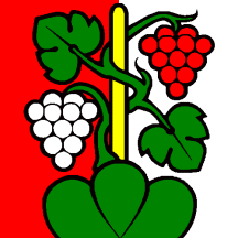 Per pale Gules and Argent overall a Vine tree growing from Coupeaux Vert on Prop Or with two grapes counterchanged.