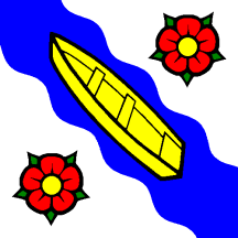 Argent between two Roses Gules barbed and seeded proper on a Bend wavy Azure a Bark Or bendwise.