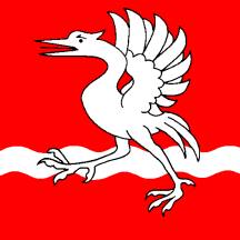 Gules, a Barrulet wavy Argent abased and overall a Crane rising of the last.