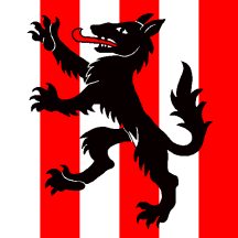 Pally of Six Argent and Gules overall a Wolf Sable rampant langued Gules.