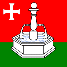 Gules, a Fountain Argent on a Base Vert and in chief dexter a Cross pattee of the same.