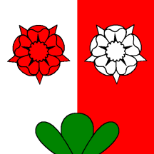 Per pale Argent and Gules two Roses countercharged and overall Coupeaux Vert.
