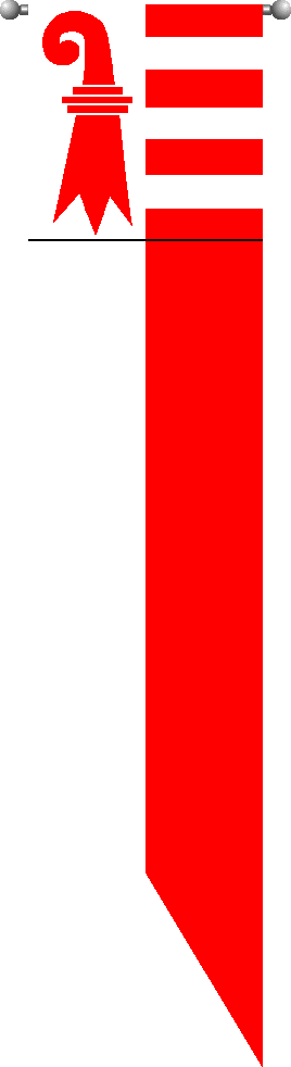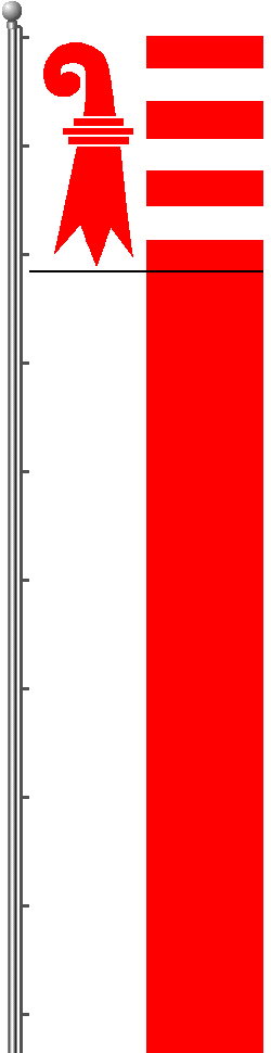 Flaggen are vertically hoisted from a crossbar in the manner of gonfanon, in ratio of about 2:9, with a swallowtail that indents about 2 units. The chief, or hoist (square part) usually incorporates the design from the coat of arms - not from the flag. The fly part is always divided lengthwise, usually in a bicolour, triband or tricolour pattern (except Schwyz which is monocolour, and Glarus which has four stripes of unequal width). The colours chosen for the fly end are usually the main colours of the coat of arms, but the choice is not always straight forward.