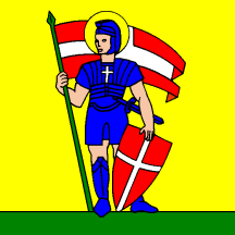 Or, standing on a Base Vert a Warrior proper in armour Azure ensigned with a Cross Argent nimbed of the field, holding a flag and shield both Gules a cross throughout of the fourth.