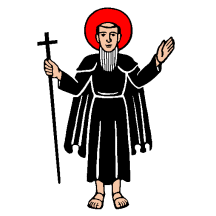 Argent, St. Magnus stantant clad as monk and cloaked Sable haloed Gules holding in dexter a Staff topped with a Cross Sable.