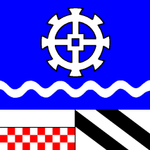 Azure a Mill Wheel Argent and a Barrulet wavy abased, and in Base per pale chequy Argent and Gules a Chief Argent and Argent two Bends Sable.
