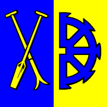 Per pale Azure an Oar and a [hook] in saltire Or and Or a Semi Mill Wheel Azure.