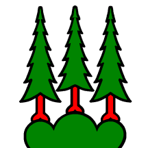 Argent three Fir Trees trunked Gules issuant from a Mount of 3 Coupeaux of the second.