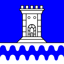 Azure a Tower Argent and on a Base of the same a Bar nebuly of the first.