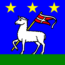 Azure a paschal lamb argent passant over a base vert holding a flag staff or with a flag swallow-tailed gules cross argent and along its top a schwenkel of the last and in chief three mullets of five or.