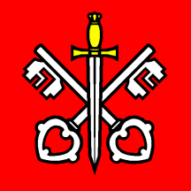Gules two keys argent in slatire and a sword pointing to base of the same hilted and pommed or.