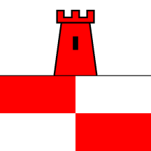 Per fess argent a tower gules issaunt and quartered gules and argent.