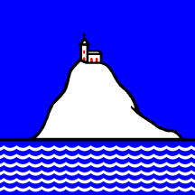 Azure a church argent with widowns and doors gules on a clif of the second issuant from a lake proper in the base.