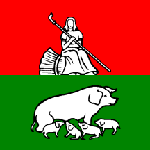 Per fess gules a shepherdess sitting on a garb all argent and vert a sow and her piglets also argent.
