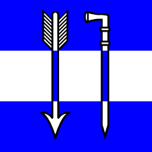 Azure a fess argent and overall in dexter an arrow point to base and in sinister a walking stick handle to chief both counterchanged.
