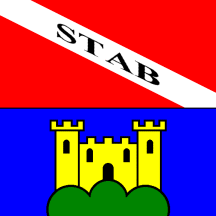 Per fess gules on a bend argent inscription STAB sable and azure a castle or issuant from coupeaux vert.