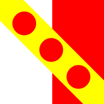Per pale Argent and Gules, overall a bend Or with three torteaus (= roundels Gules).